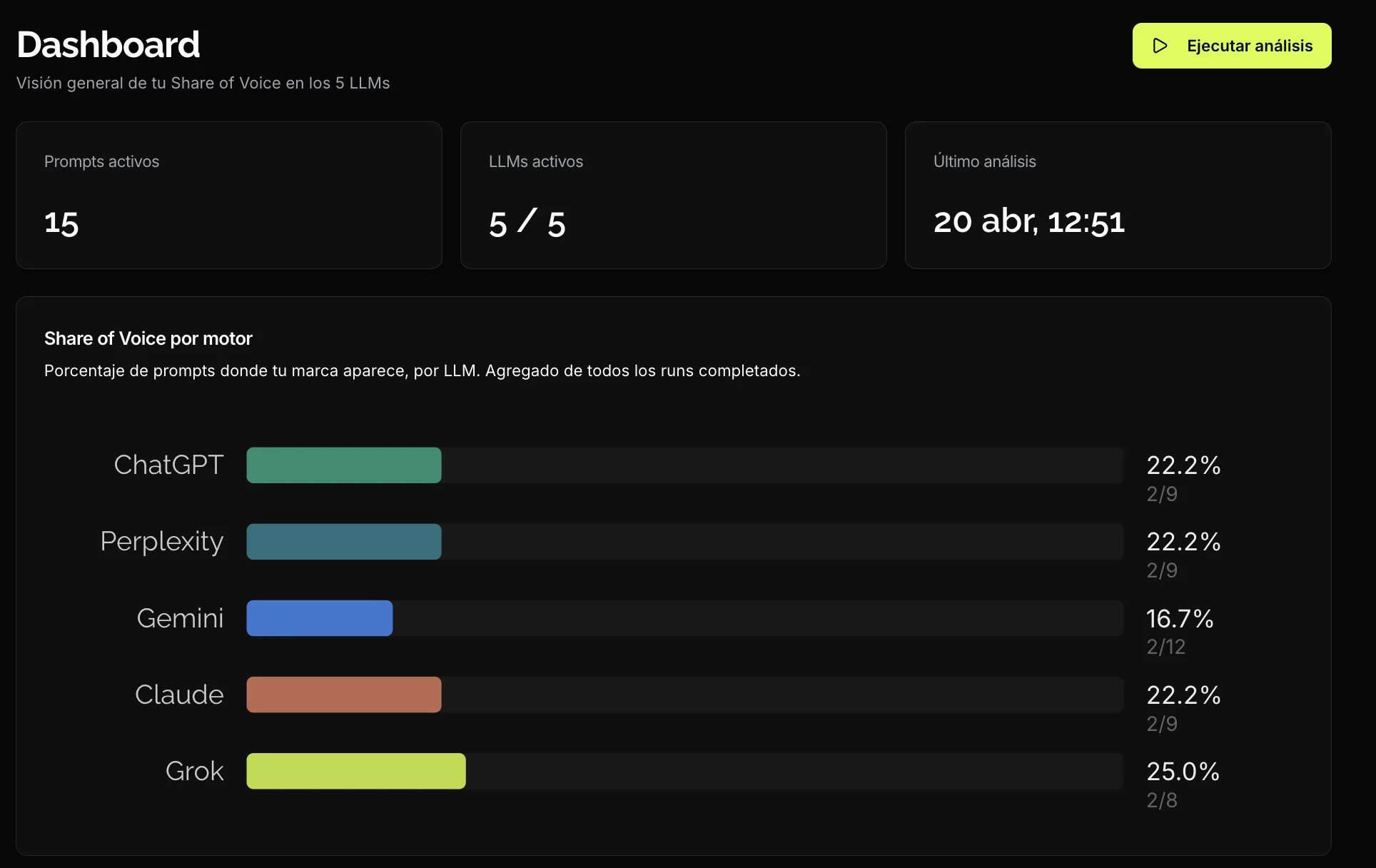 - Share of Voice medio: 21,6 % (media aritmética de los 5 LLMs).